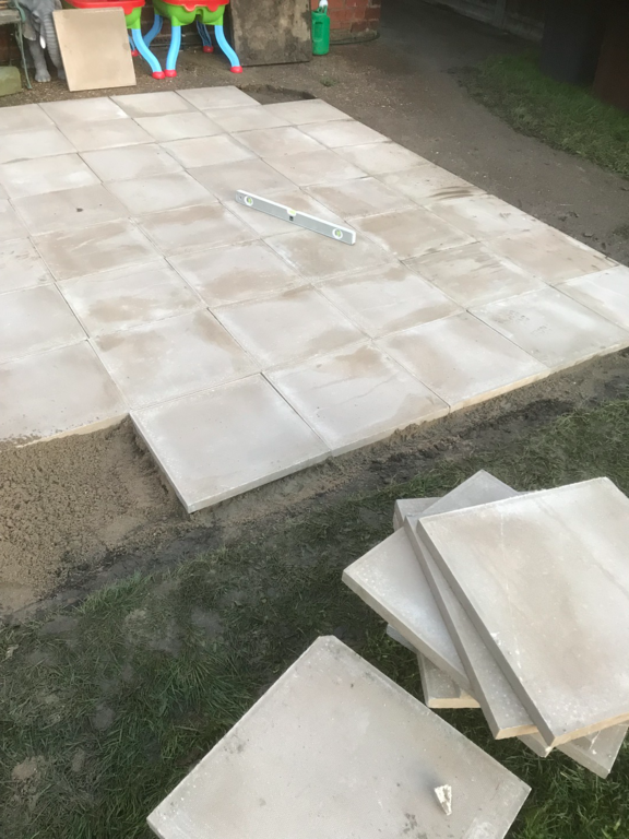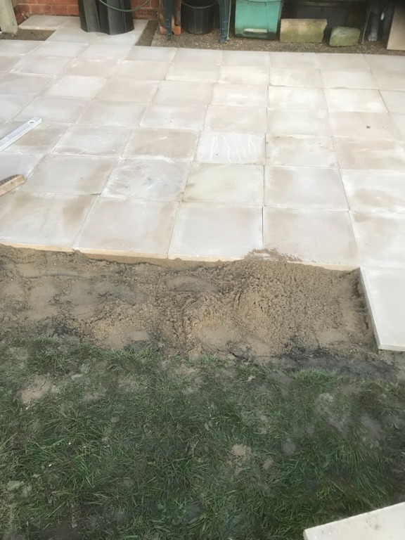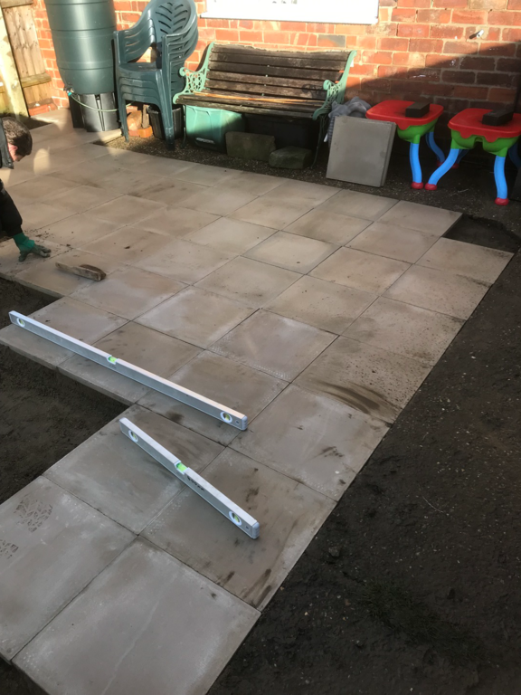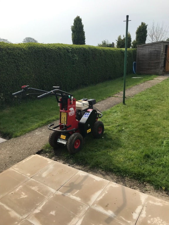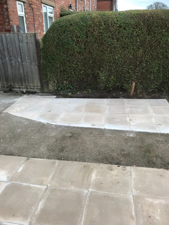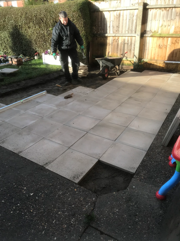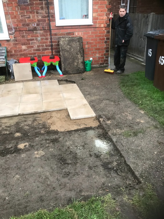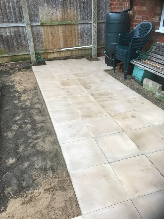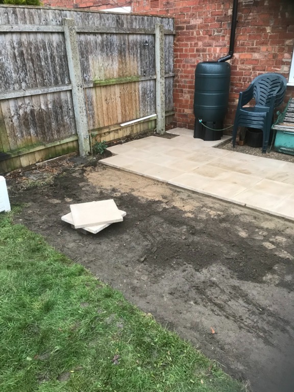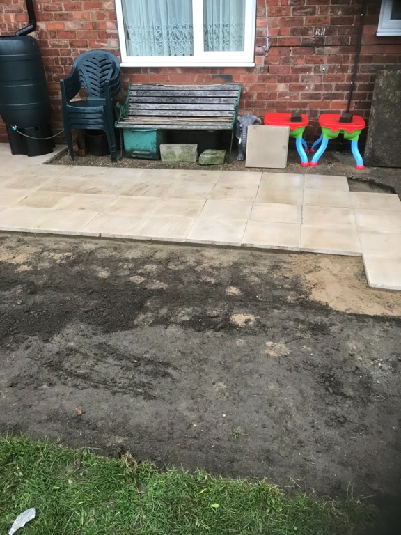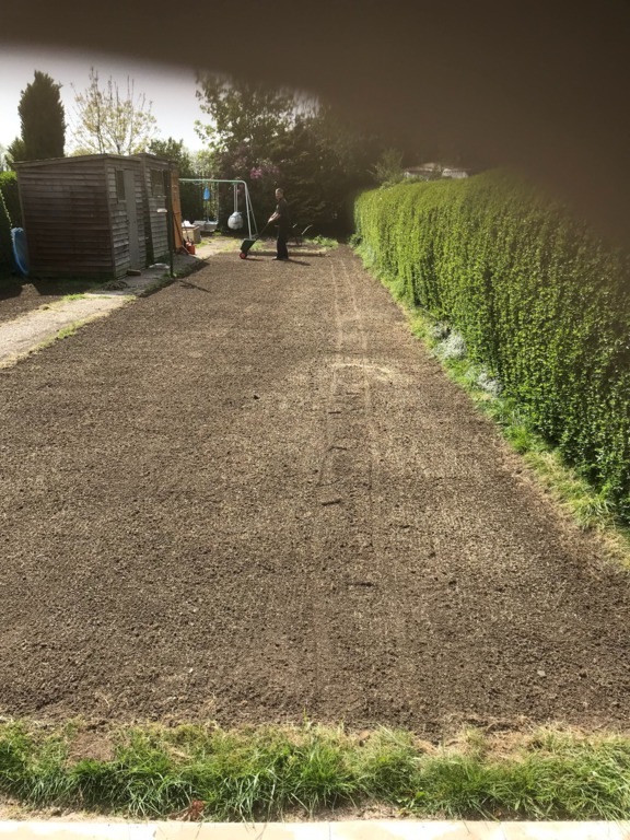 Once the design was agreed, all the turf was removed and taken away, leaving a blank canvas, the main area by the back of the house was made into a patio, taking the line to the other side of the existing path, creating a separate space for the bins to maximise the patio space. the whole area that was to become the lawn, was cleared and levelled ready for grass seed to be laid