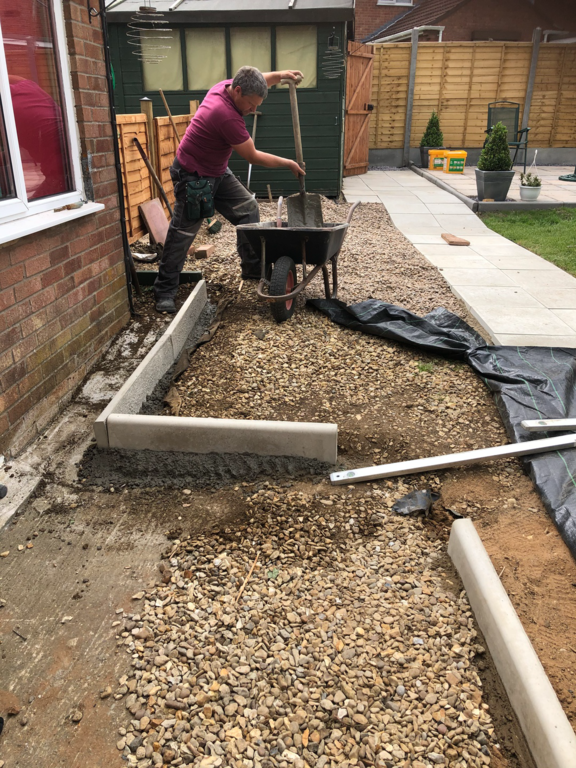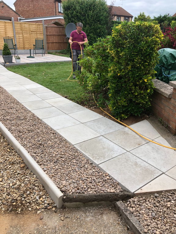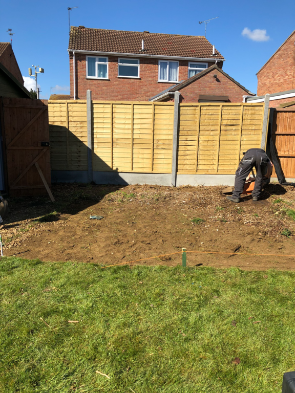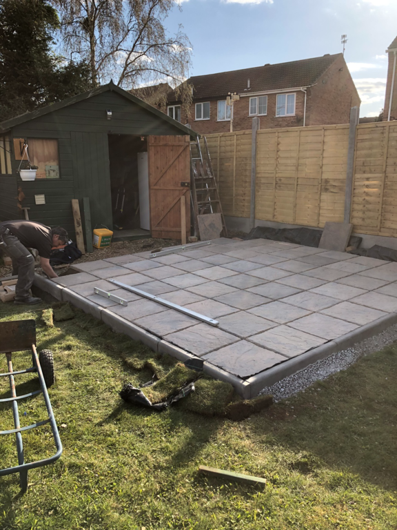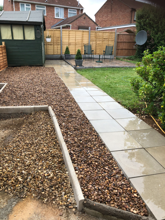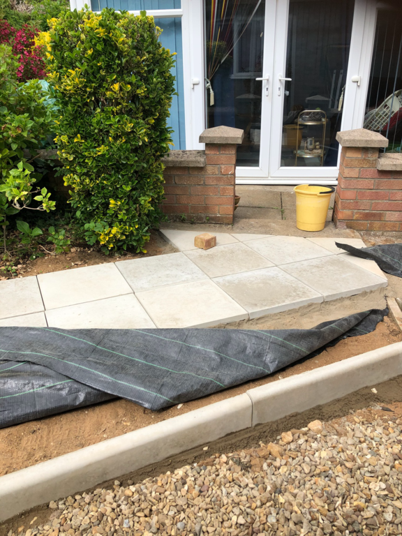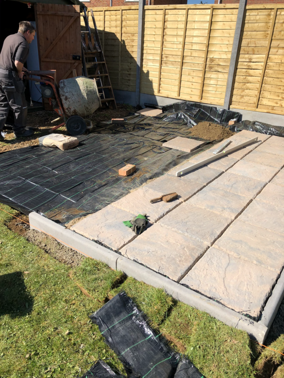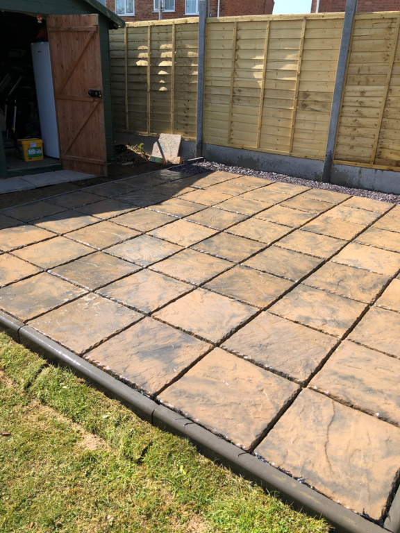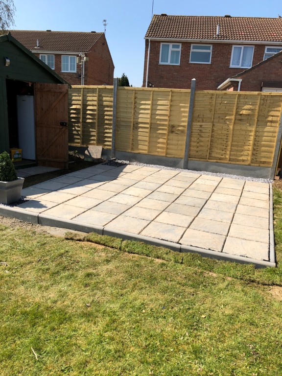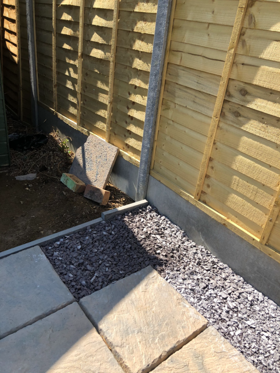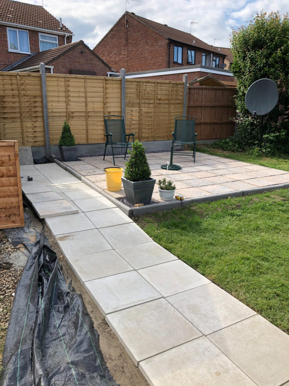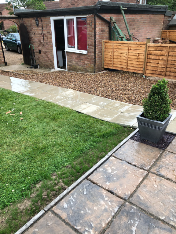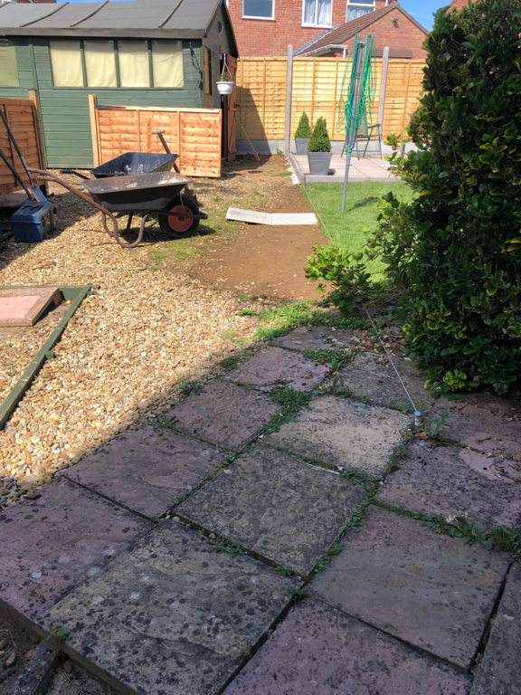 Once we have sorted out an easy to maintain garden design was agreed, we started by sorting out their hedges by trimming and levelling them and taking one out fo the hedges then putting up a new fence at the top of the garden foaled by a new patio and pathway to their garage and shed.